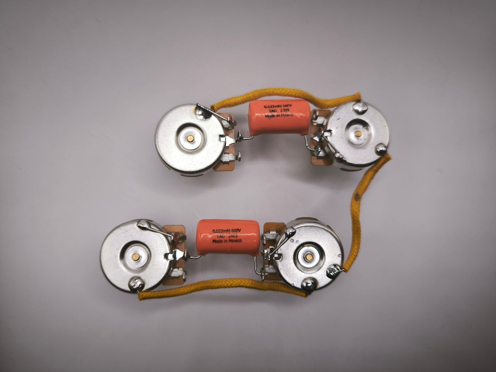 - 4 potentiomètres 500k : 2 volumes (log), 2 tonalités (linéaire), au format US (axes laiton splittés, 24 cannelures – filetage longueur et diamètre 9.52mm - 3/8")